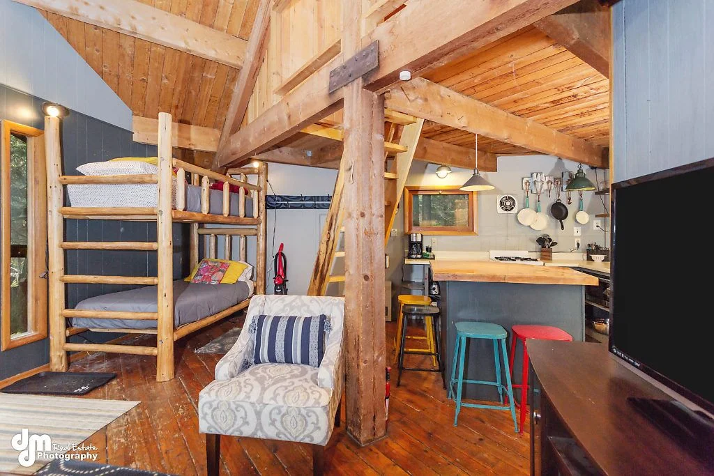 This feeling continues with the exposed beams and rough-hewn bunk beds, as well as the entire loft space upstairs. It’s so homey, cozy, and rustic.