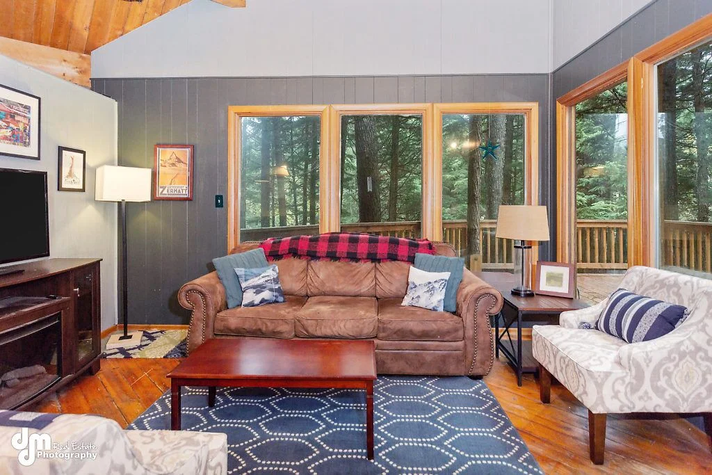 And yet the living room space could fit into any modern home, with comfy couches and a nice, large television. Check out how you still feel like you’re part of the forest with those large windows!