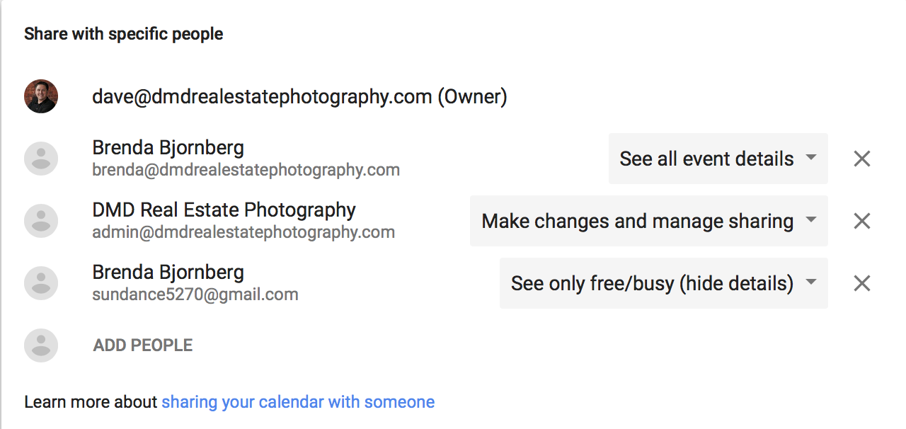 Inside the settings and sharing option you will be able to add our admin’s email account. Please use admin@dmdrealestatephotography.com. Give that email access to make changes and manage sharing.